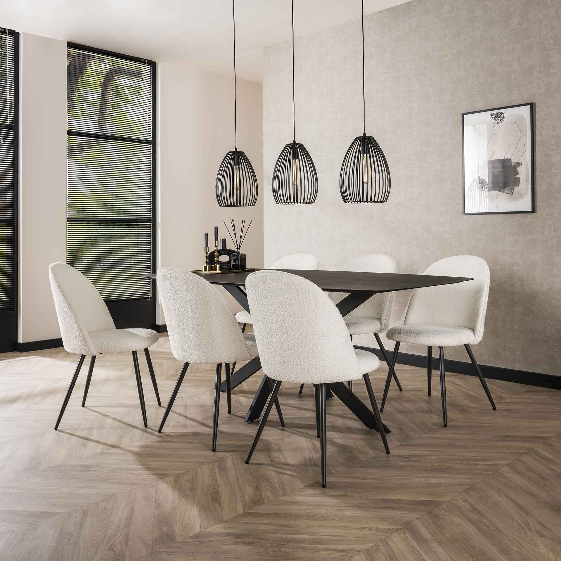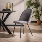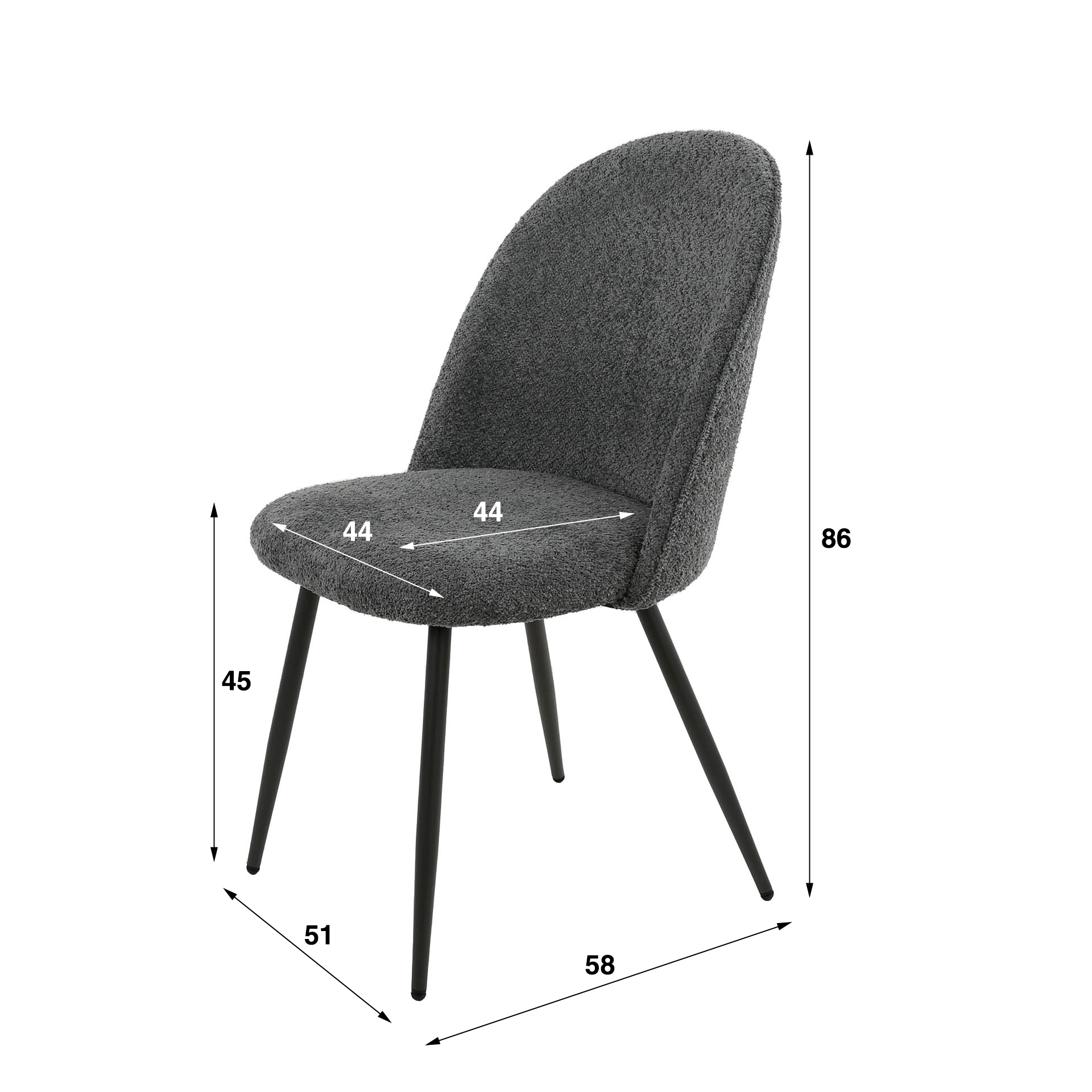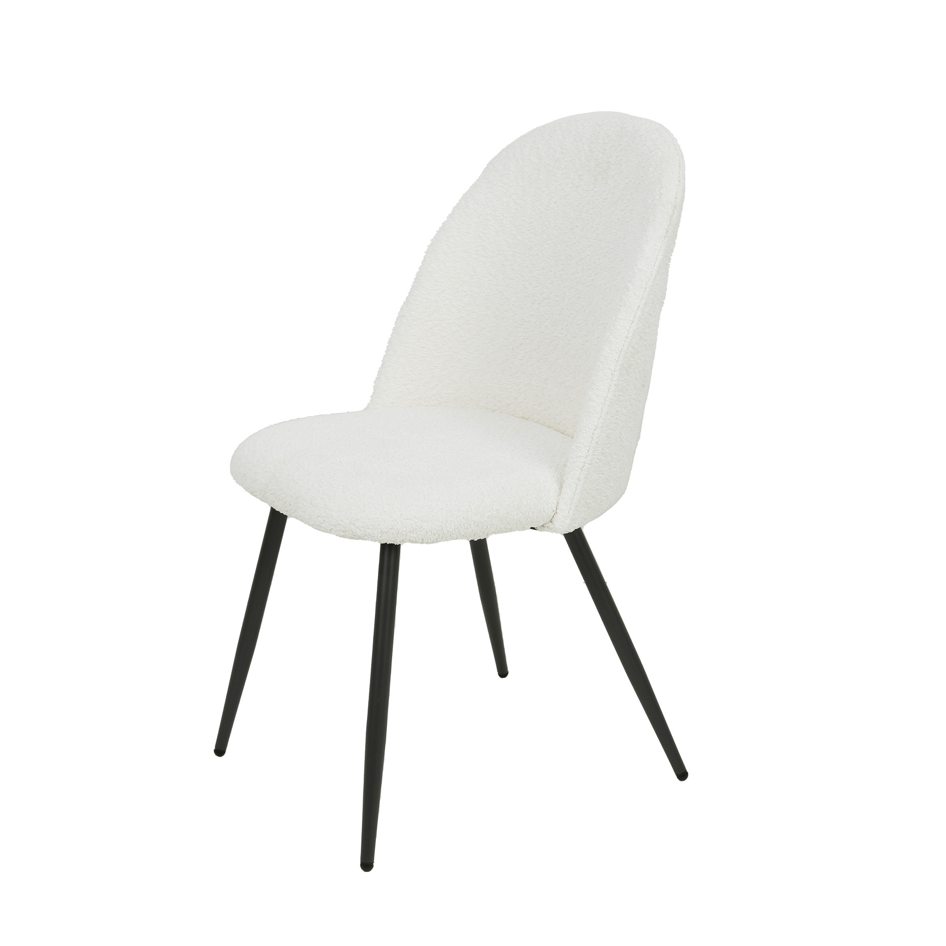 Užapvalinto atlošo kėdė. Audinys bukle, rėmas metalo. Spalvos: balta, pilka, smėlinė.