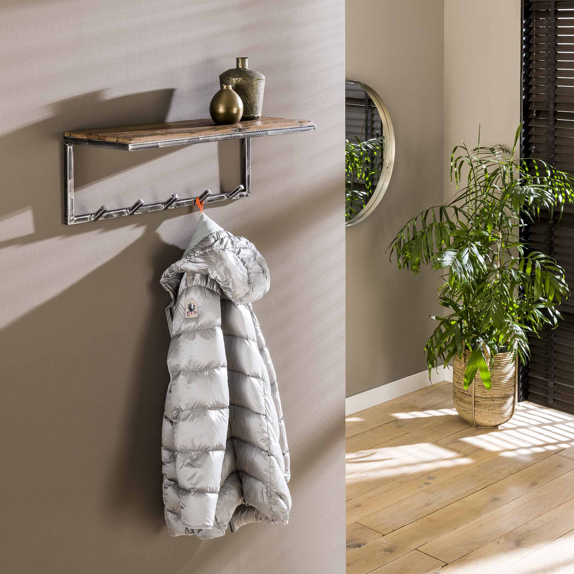 Kietmedis.Rėmas ir kabliukai pagaminti iš poliruoto metalo. Kiekviena kabykla unikali. Yra 2 tvirtinimo taškai, kurie supaprastina kabyklos montavimą.